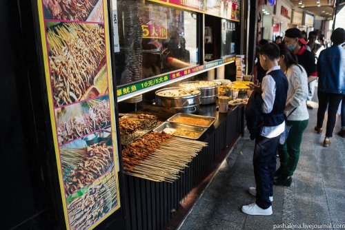 На улице открыто множество забегаловок со всевозможными яствами. В основном, конечно, известные китайские шашлычки, лапша, коктейли и всякие фрукты-овощи, но встречается несколько мест и с более изысканными блюдами! В них подают устриц.