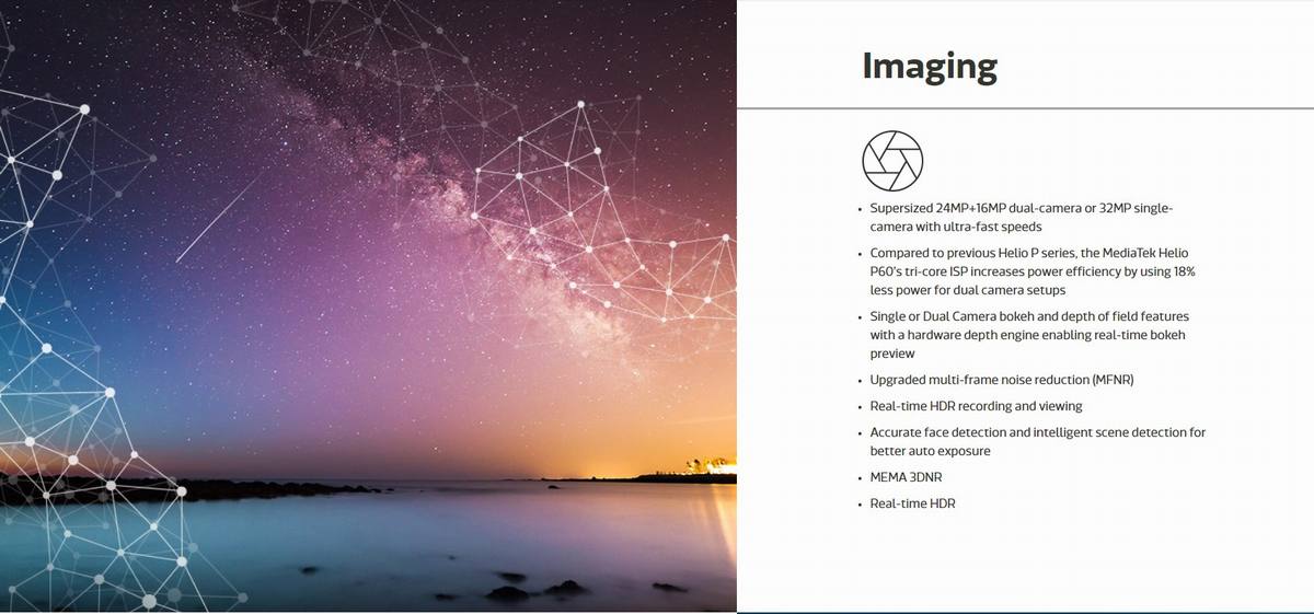 В плане поддержки камер высокого разрешения и в принципе распознавания нескольких фотомодулей, новый процессор от Mediatek, безусловно, порадовал. Что имеем: максимальное разрешение двойного фотомодуля не должно превышать 24 МП + 16 МП (а большего и не надо), а одинарного 32 МП - тут уж тем более. Новые технологии в Helio P60, а точнее трехъядерное ISP позволяет снизить энергопотребление при использовании двойных камер на 18% при возросшей производительности. Также смартфоны с Helio P60 смогут демонстрировать пользователям боке в реальном времени при съемке портретных фото как на двойную, так и на одиночную камеры. Если вы подумали, как же устройства смогут делать портреты на одиночные камеры, то вспомните Google Pixel. И да, Google уже предоставила исходники своей камеры, так что в скором времени боке мы сможем наблюдать и на супердешевых аппаратах. Возникает лишь один вопрос - как долго фото будут обрабатываться после щелчка затвора? Если брать сегодняшний Helio P60, то практически молниеносно.