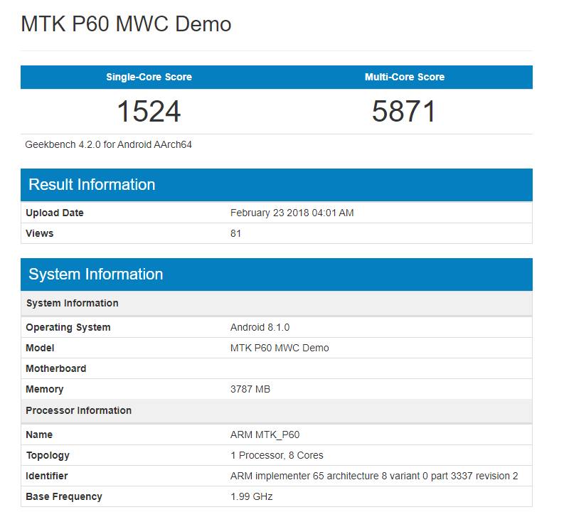 Помимо технической части стоит рассказать и том, насколько хорош новый чип в реальных условиях. Итак, Helio P60 уже успел пройти тестирование в синтетическом бенчмарке GeekBench на тестовом устройстве с 4 ГБ оперативной памяти и операционной системой Android 8.1 Oreo. Производительность чипсета показала, что в одноядерном режиме Helio P60 набирает до 1524 баллов, а в многоядерном около 5871 балла. Стоит сказать, что аналогичные показатели демонстрирует и Snapdragon 660, который сегодня трудится в таких аппаратах, как Xiaomi Mi Note 3, Vivo X20 и многих других.