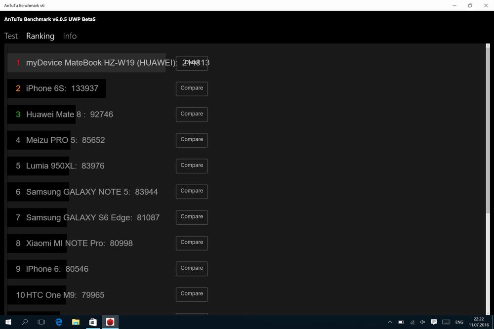 Аппаратная начинка Huawei Matebook позволяет девайсу с лёгкостью воспроизводить 4К-видео и запускать множество компьютерных игр. Например, World of Tanks: Blitz идет на устройстве с отличным фреймретом 60 кадров в секунду при максимальных настройках графики. Хотя это немного и глупо, но в Антуту Huawei Matebook выдает более 210000 баллов. На скриншотах вы можете лицезреть результаты тестов в Антуту и PC Benchmark - сравните их с результатами ваших ноутбуков. Кстати, Huawei Matebook практически не нагревается и корпус при нагрузке становится слегка теплым - что еще нужно от компактного ноутбука или планшета.